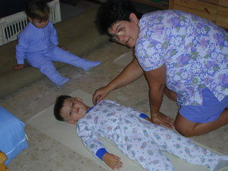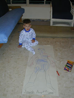 Then we layed down on the paper and Mama took a black crayon and traced around us. First Josiah... | |