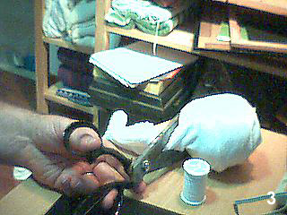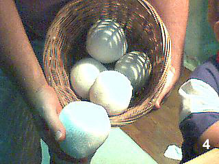 | We cold have used colored socks too to make the balls nicer, but white was ok too. Daddy used a sharp pair of scissors to cut the sock just above the ball of rags. Then he used a needle and thread to sew up the hole to make a sock ball. We made five sock balls. Then mama found a basket and we practiced throwing the sock balls into the basket. |