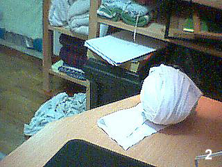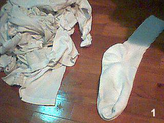 | Tonight we made Sock Balls for family night. Daddy went through his sock drawer and T-shirt drawer and found some old socks and old shirts that he wanted to get rid of. Then mama cut up the T-shirts into long strips. We all rolled the strips into balls, although Miranda wanted to unroll them instead. Then we stuffed the ball of rags into one of the old socks. It was fun to swing the ball in the sock and hit people. I hit Miranda several times. She didn't like it much.