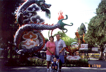 | We are standing in front of a large Dragon at the entrance of Qianfuo Shan (1000 Buddah Mountain). We happened to visit during their dragon festival. The park was decorated with a myriad of dragons taking all shapes and forms. There were dragons in with bodies of birds, fish, turtles as well as the traditional fierce fire breathing dragons. |