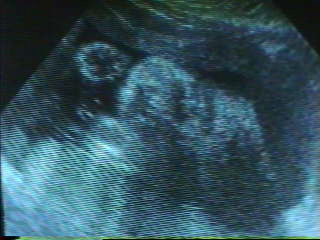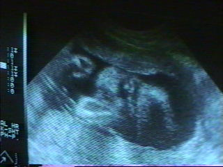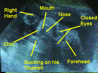 | This week we got to see our un-born son’s face. Below are 2 views of his face and a diagram to help you figure out the pictures. The coolest thing was that we could see him sucking on his thumb. His little cheeks were moving in and out. Only 11 more weeks to go. |