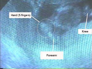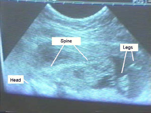 | It's the 16th week. At 20 weeks we'll be able to tell you if it's a boy or a girl. These photos weren't as good as the last ones but there was a lot more detail. The best part was seeing the baby's hand move, which almost looked like it was waving to us, and the beating heart which was visible. It was beating at 152 bpm. Unfortunately the baby was facing away from the camera so it was hard to get a good shot of the head and face. It was also very active making it difficult to focus on any particular area. |